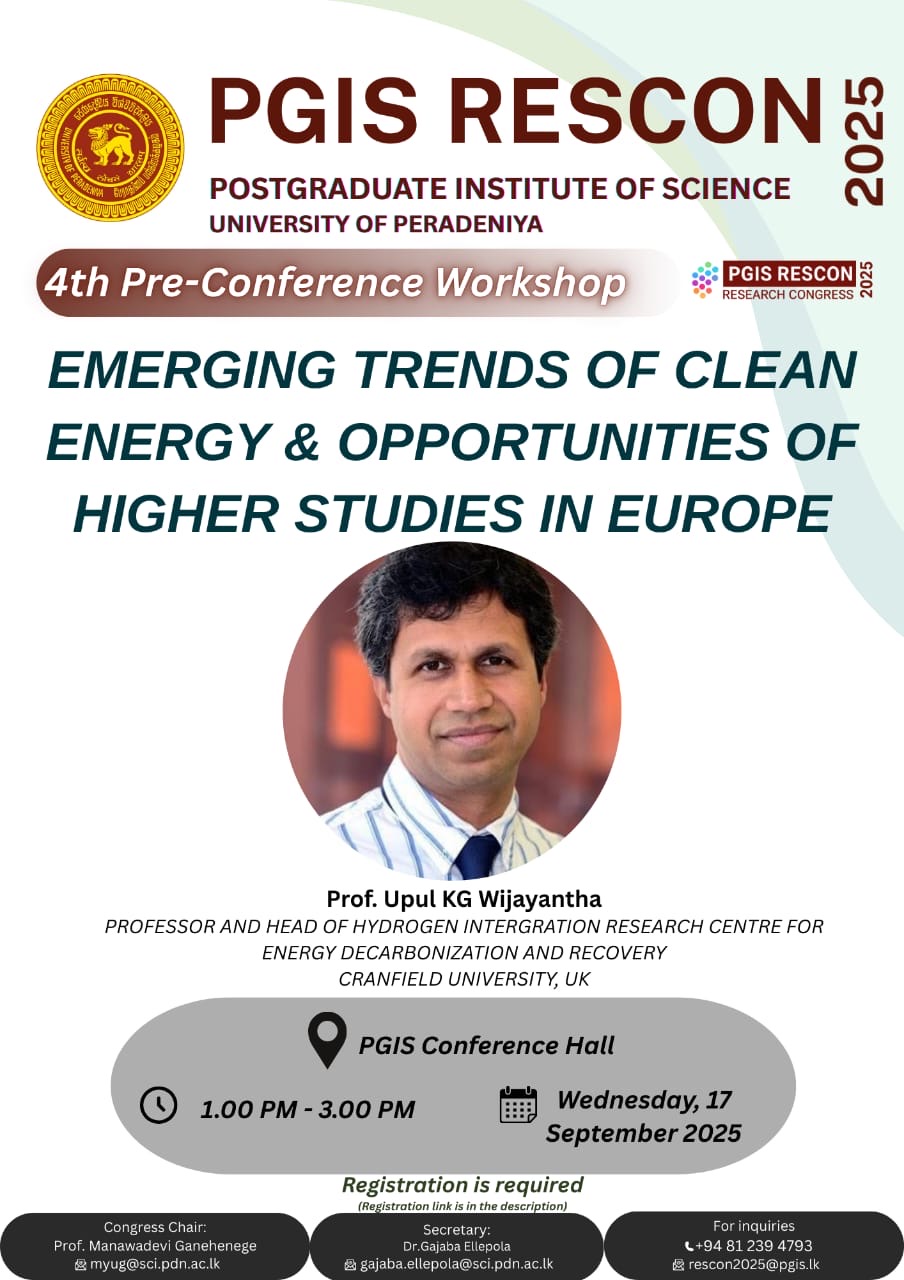 We are pleased to announce the 4th Pre-Conference Talk for RESCON 2025, to be delivered by Professor Upul Wijayantha (UK), a leading researcher in clean energy and hydrogen technologies. All students and early-career researchers are encouraged to attend.